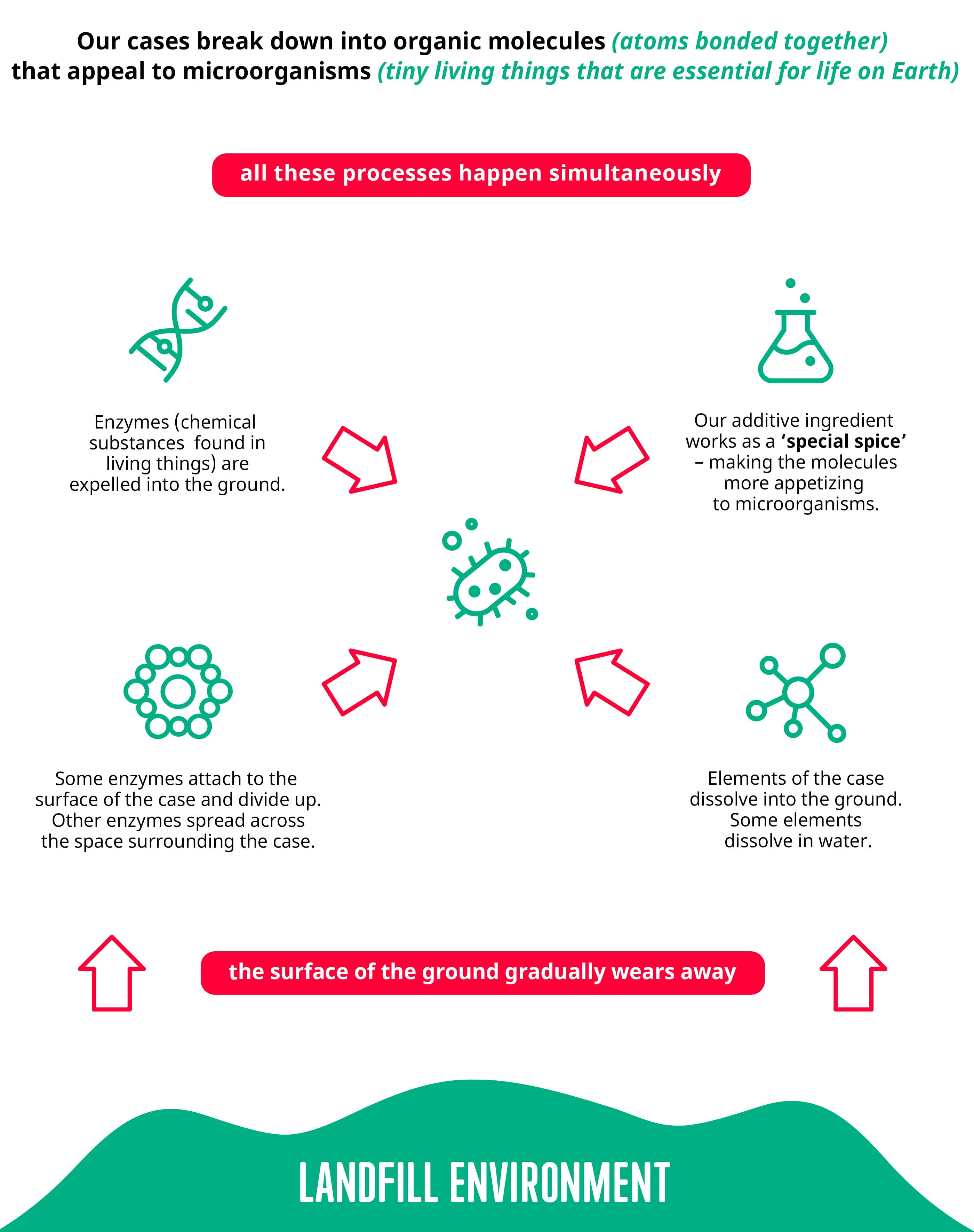 Essentially, this additive acts as a ‘special spice’, making for a tastier phone case for microorganisms found in landfill that fully digest the plastic into organic molecules in just a few years, rather than thousands – leaving nothing behind in the environment.