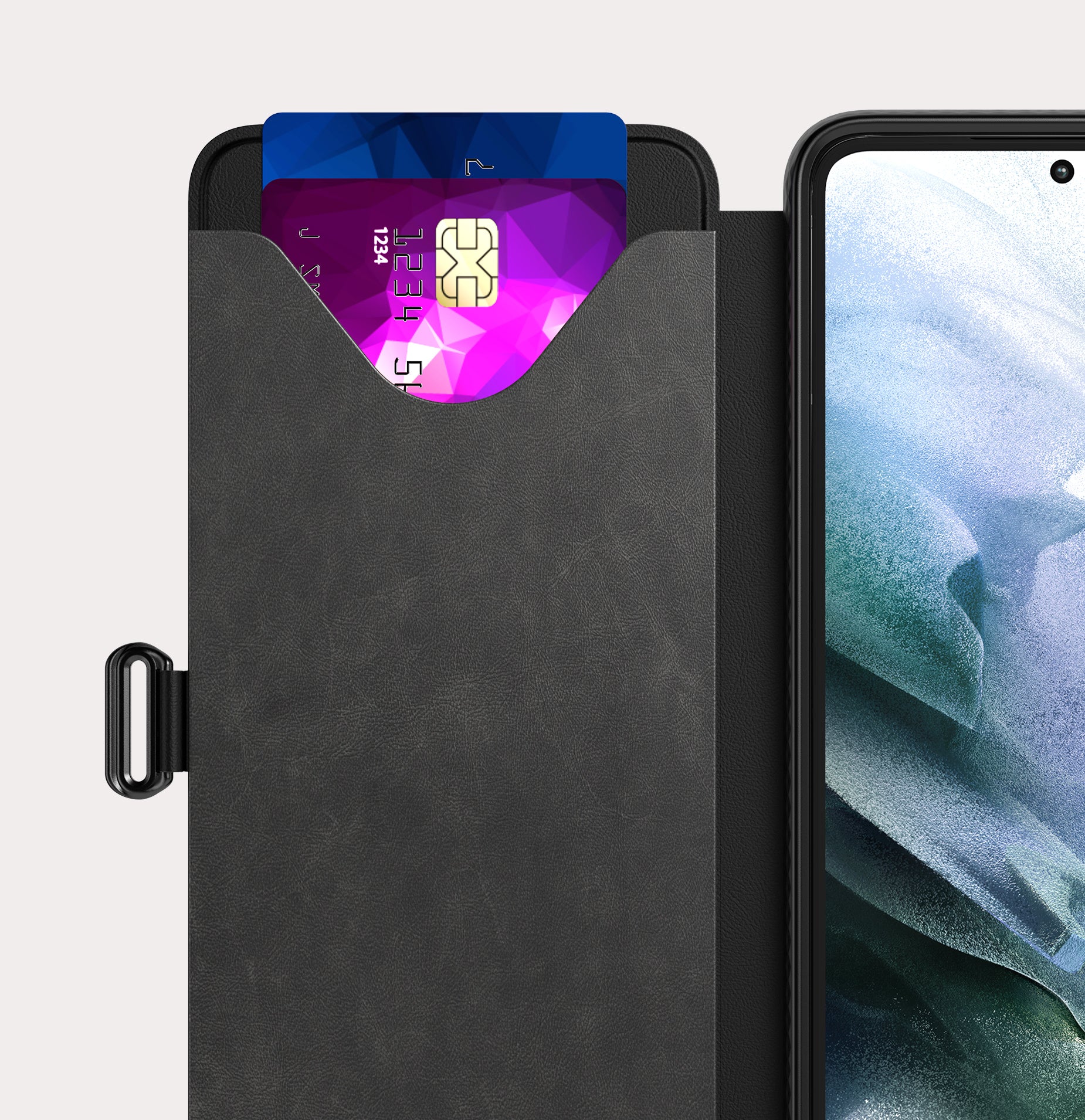 A whole lot of convenience in one case. The seal and dedicated card storage means you can ditch your wallet, while an additional stand feature makes screen-viewing a breeze.